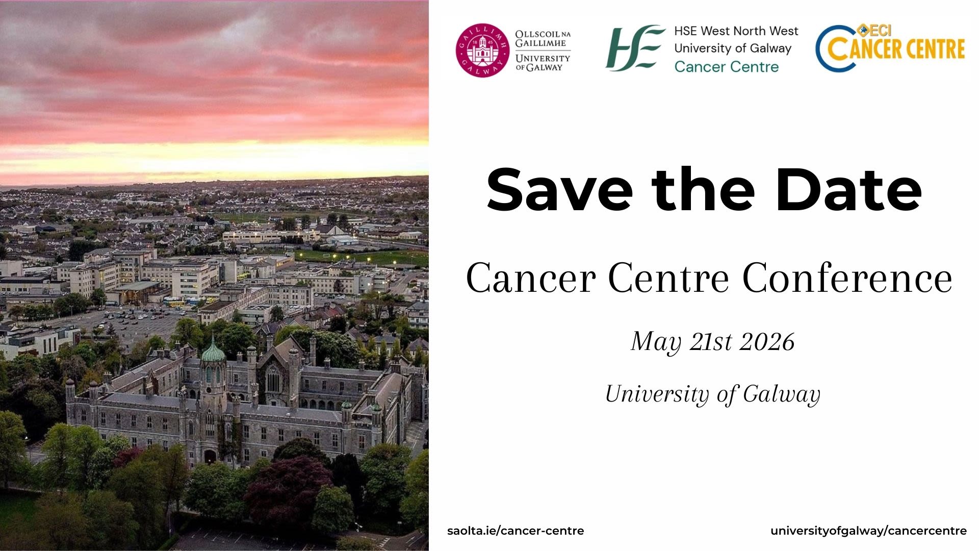 23 February: Save the Date in your diary for the inaugural HSE West and North West Cancer Centre Conference, taking place in the Human Biology Building, University of Galway. More details to come.